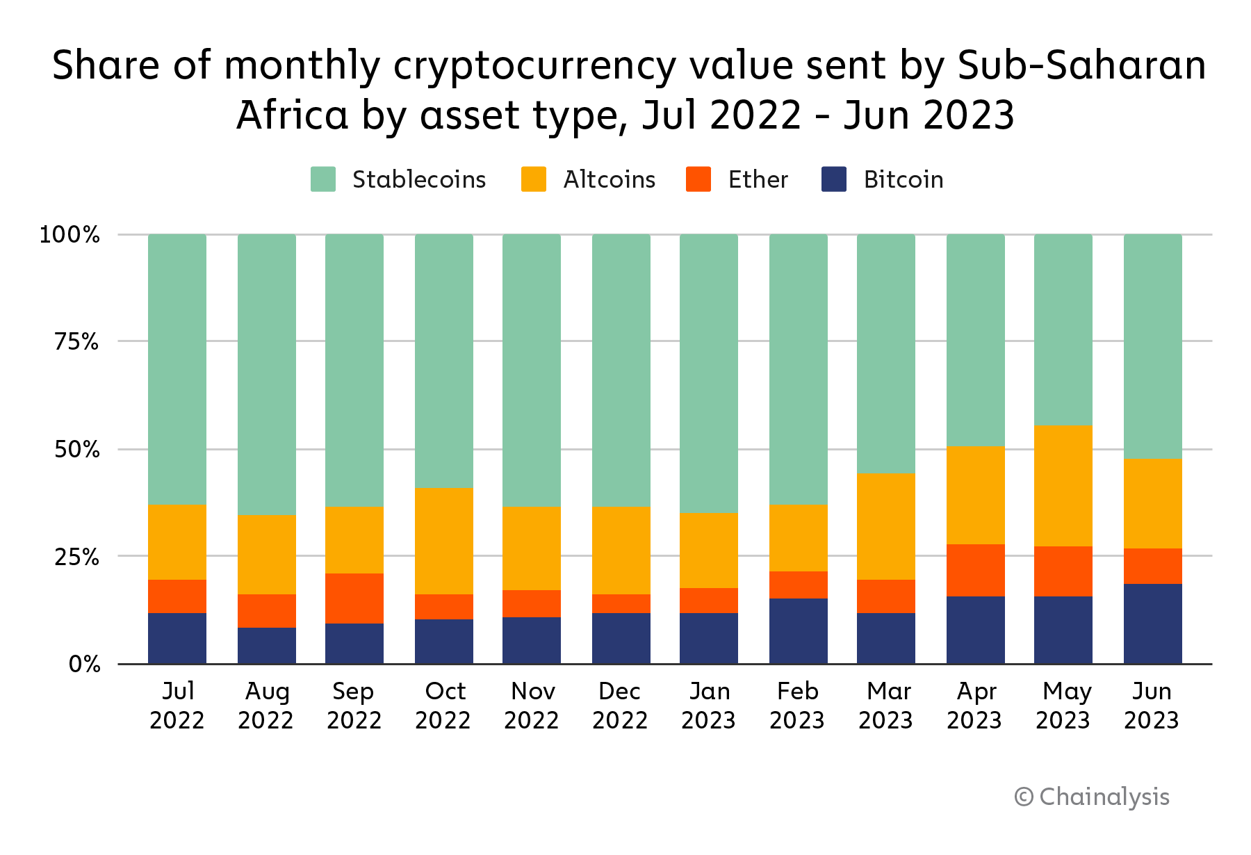 - Chainalysis data shows that Sub-Saharan Africa has experienced a “proportionally large percentage of monthly stablecoin value” relative to other asset types.